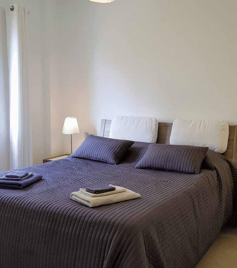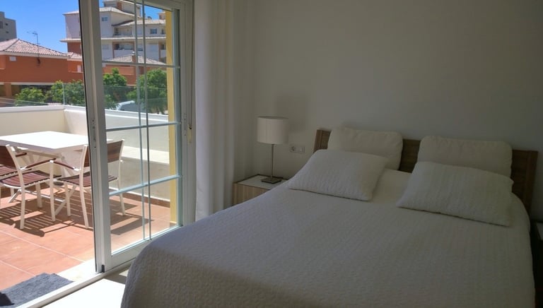 Sovrum 1 (master bedroom) har dubbelsäng, eget badrum och direkt tillgång till terrassen via stora glasdörrar.