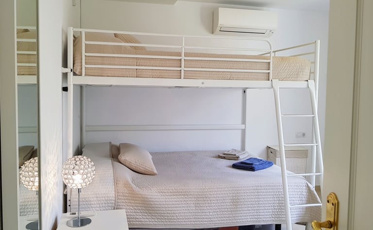 Sovrum 2 har loftsäng med 2 dubbelsängar, vardera med bredd 1,40.