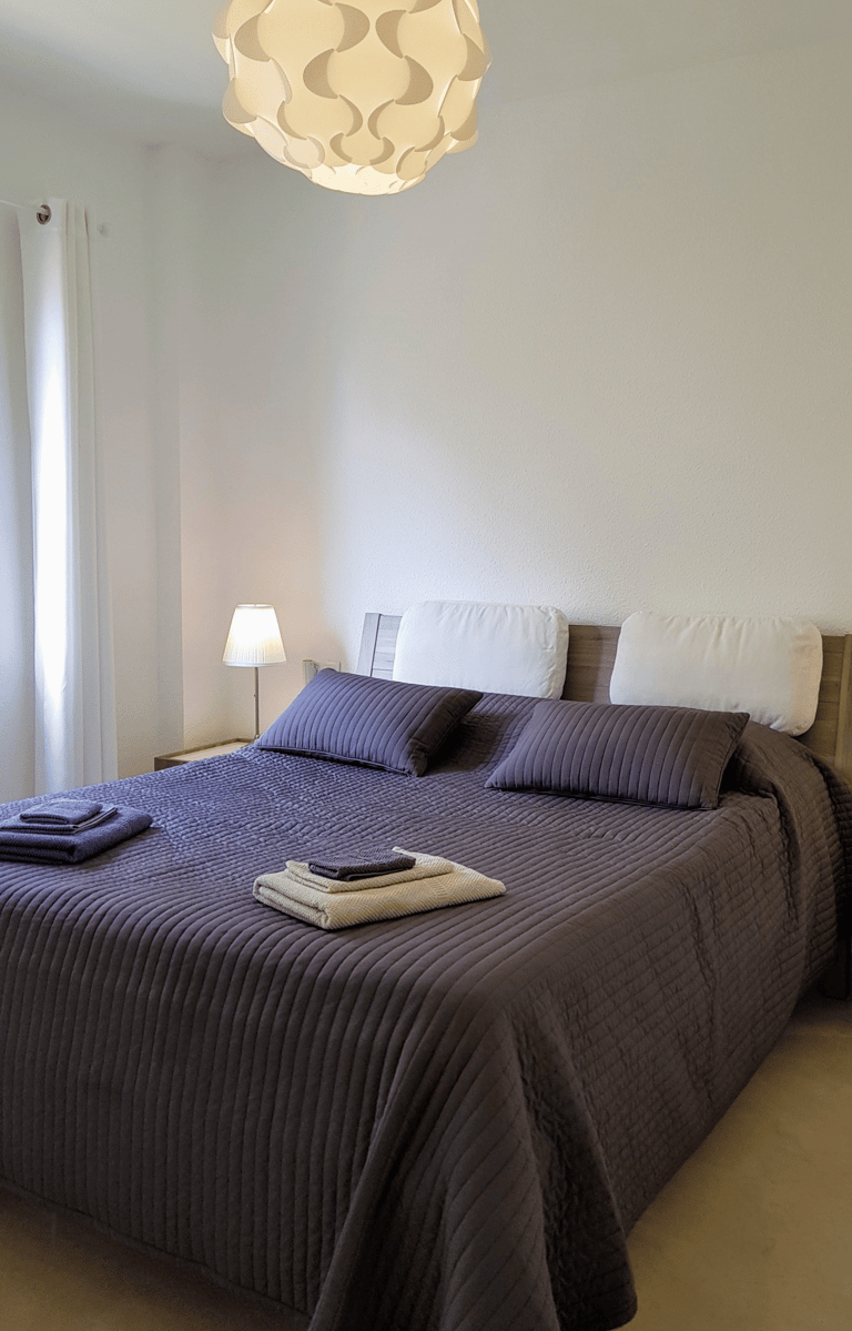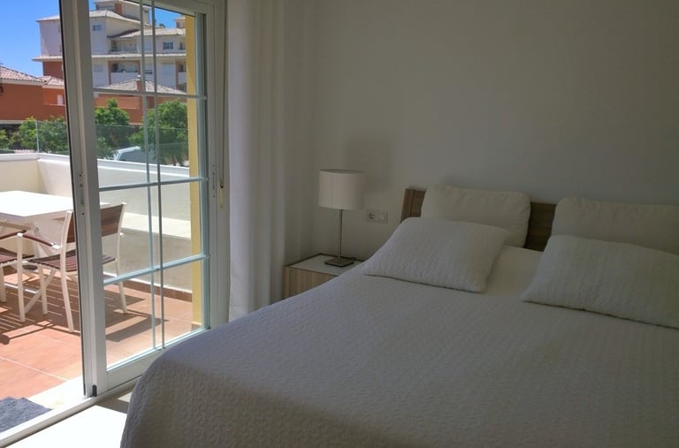 Soverom 1 (master bedroom) har dobbeltseng, eget bad og direkte utgang til terrassen via store glassdører.
