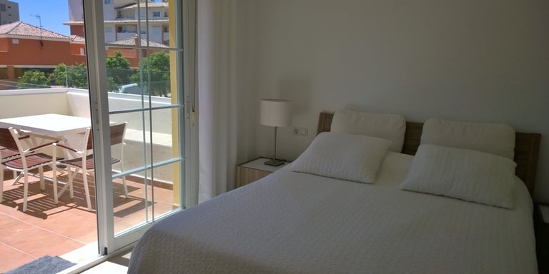 Sovrum 1 (master bedroom) har dubbelsäng, eget badrum och direkt tillgång till terrassen via stora glasdörrar.