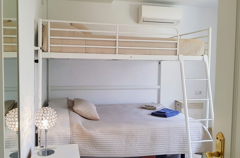 Sovrum 2 har loftsäng med 2 dubbelsängar, vardera med bredd på 1,40.